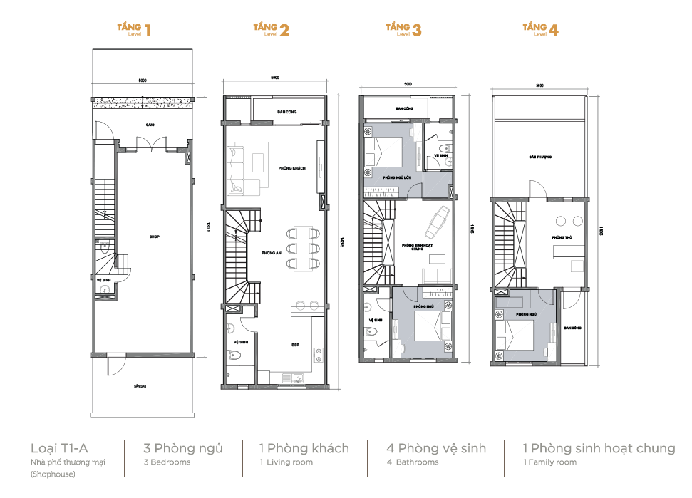 Đáp ứng đầy đủ nhu cầu của gia chủ là kinh doanh buôn bán và nhà ở sinh hoạt, thiết kế của nhà phố thương mại gồm tầng 1 là mặt sàn rộng thoáng – không gian kinh doanh cho các lĩnh vực như cafe, nhà hàng, showroom ô tô, nội thất, … Tầng 2 – 4 có lối đi thang bộ riêng, đảm bảo không gian sống tách biệt cho gia đình.