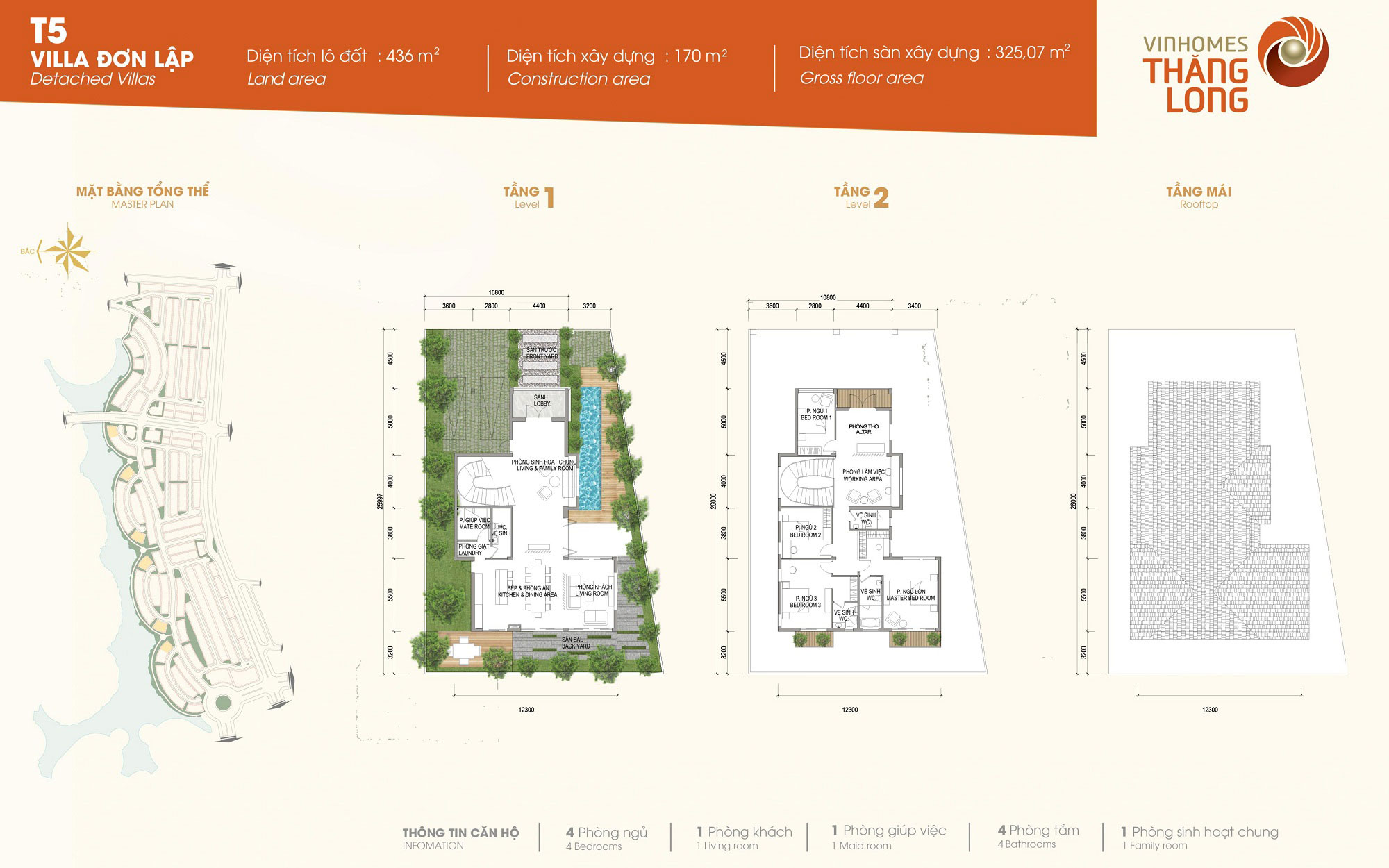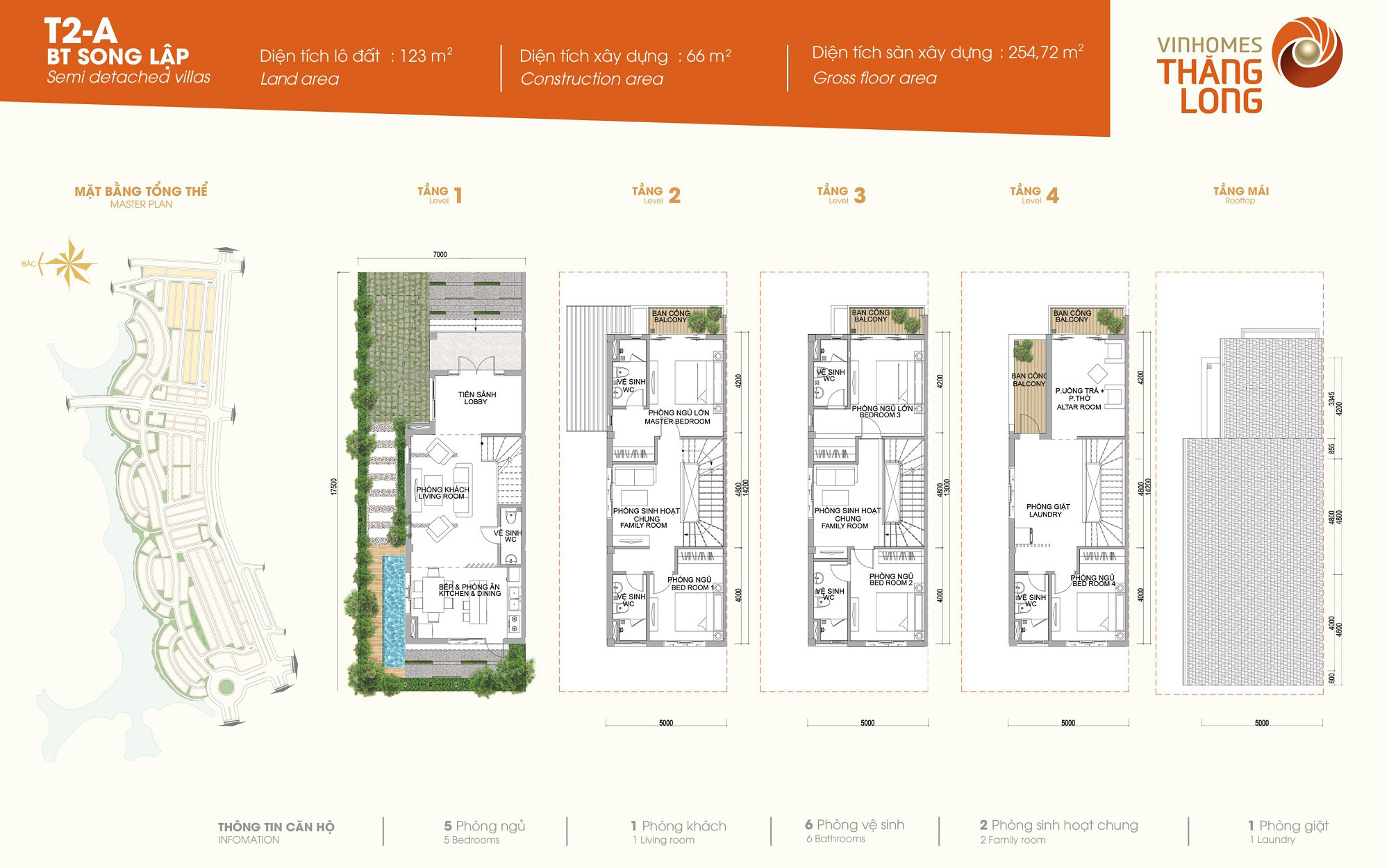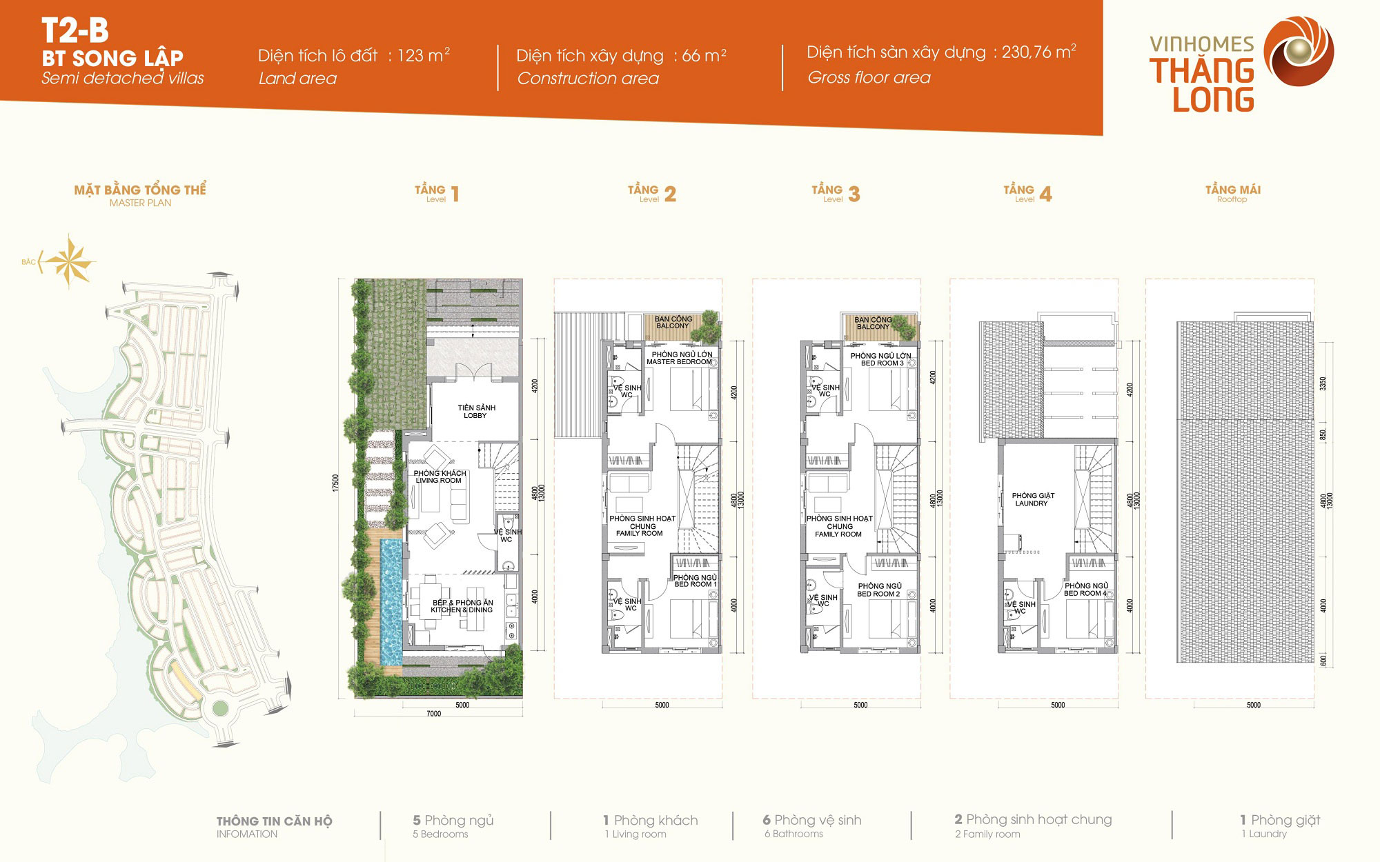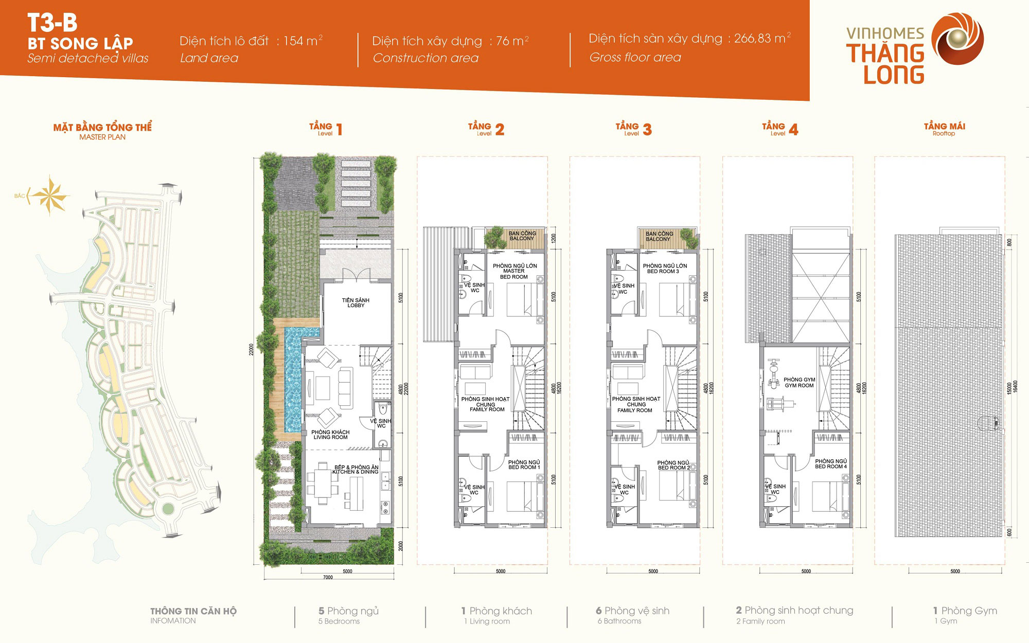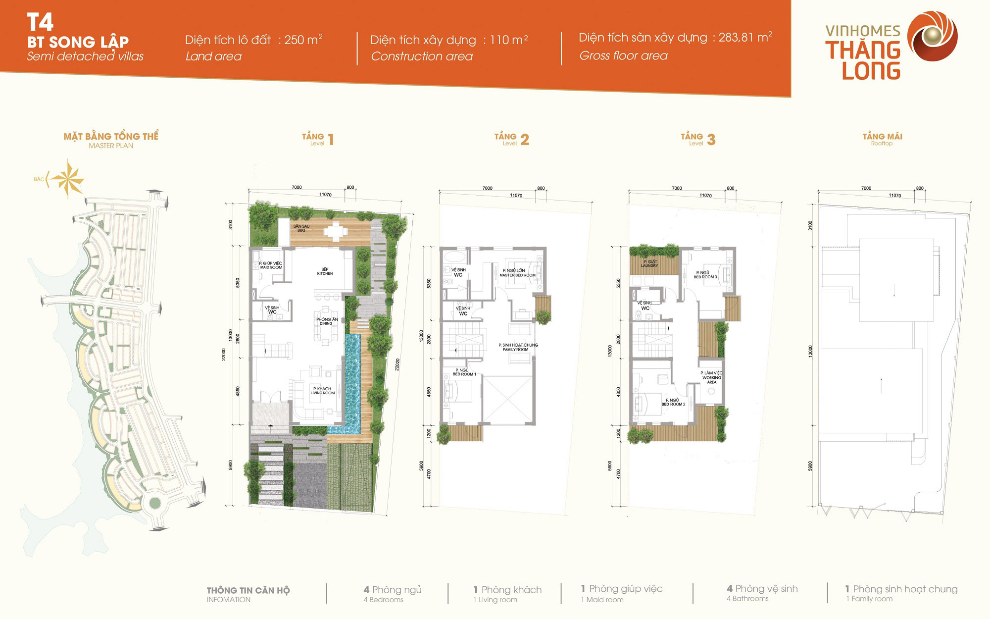 Biệt thự Vinhomes Thăng Long: Mẫu song lập T2-A, T2-C, xây dựng 4 tầng, thiêt kế 5 phòng ngủ, 1 phòng khách, 6 phòng vệ sinh, 3 phòng sinh hoạt chung
