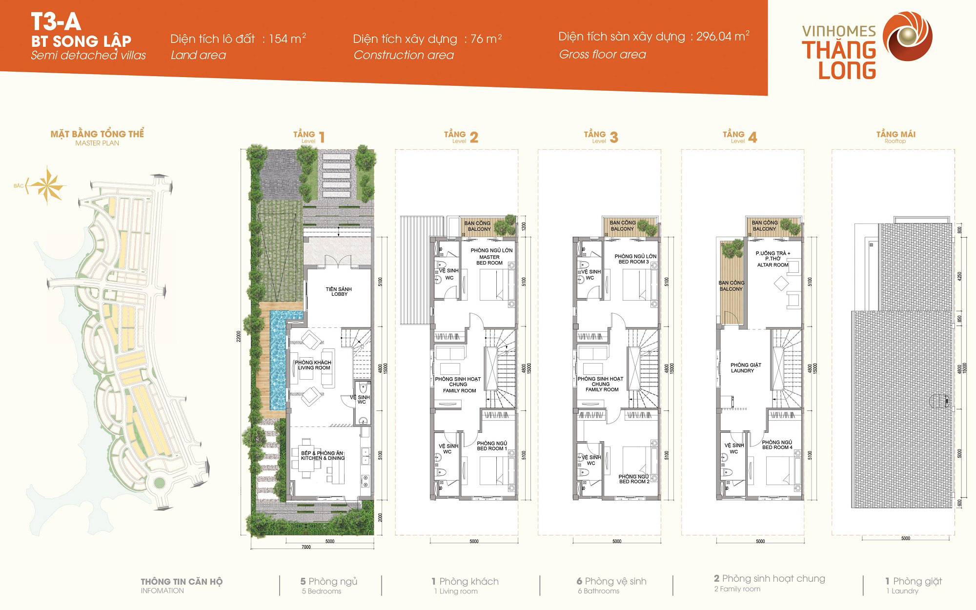 Biệt thự Vinhomes Thăng Long: Mẫu song lập T3-A, xây dựng 4 tầng, thiêt kế 5 phòng ngủ, 1 phòng khách, 6 phòng vệ sinh, 2 phòng sinh hoạt chung, 1 phòng giặt
