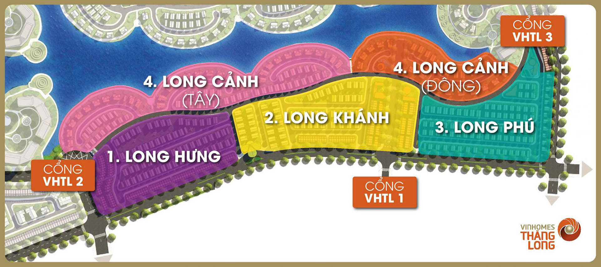 Dự án được chia thành 5 Tiểu khu lấy cảm hứng từ địa thế “Rồng nhả ngọc” của Vinhomes Thăng Long, cụ thể như sau: